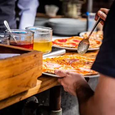 Die Pizza- und Flammkuchen-Station liefert frische Belag-Variationen auf knusprigem und hausgemachtem Teig.